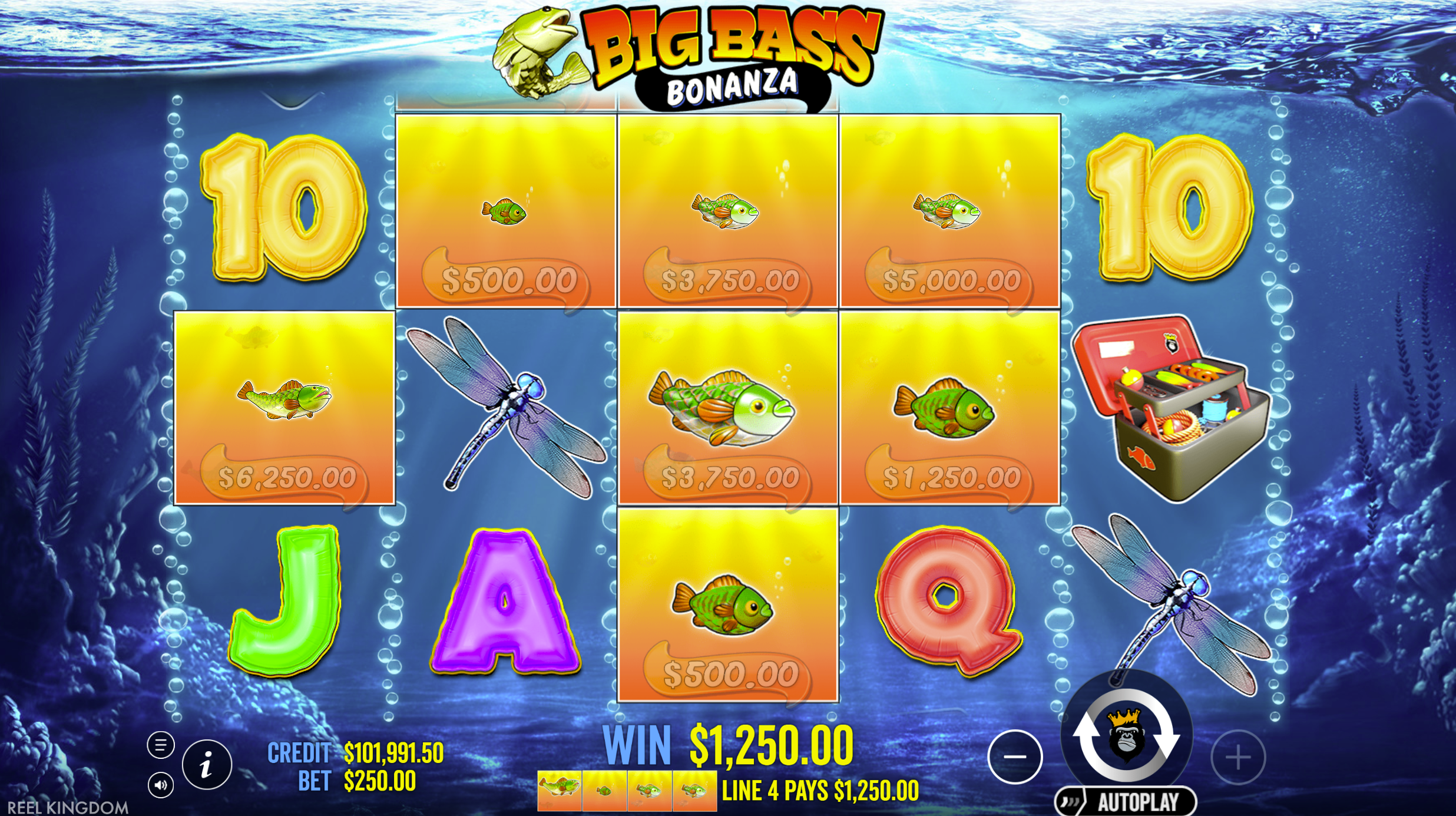• Money Symbol Collection: Golden fish with cash values collected when Fisherman Wild appears on reel 5.